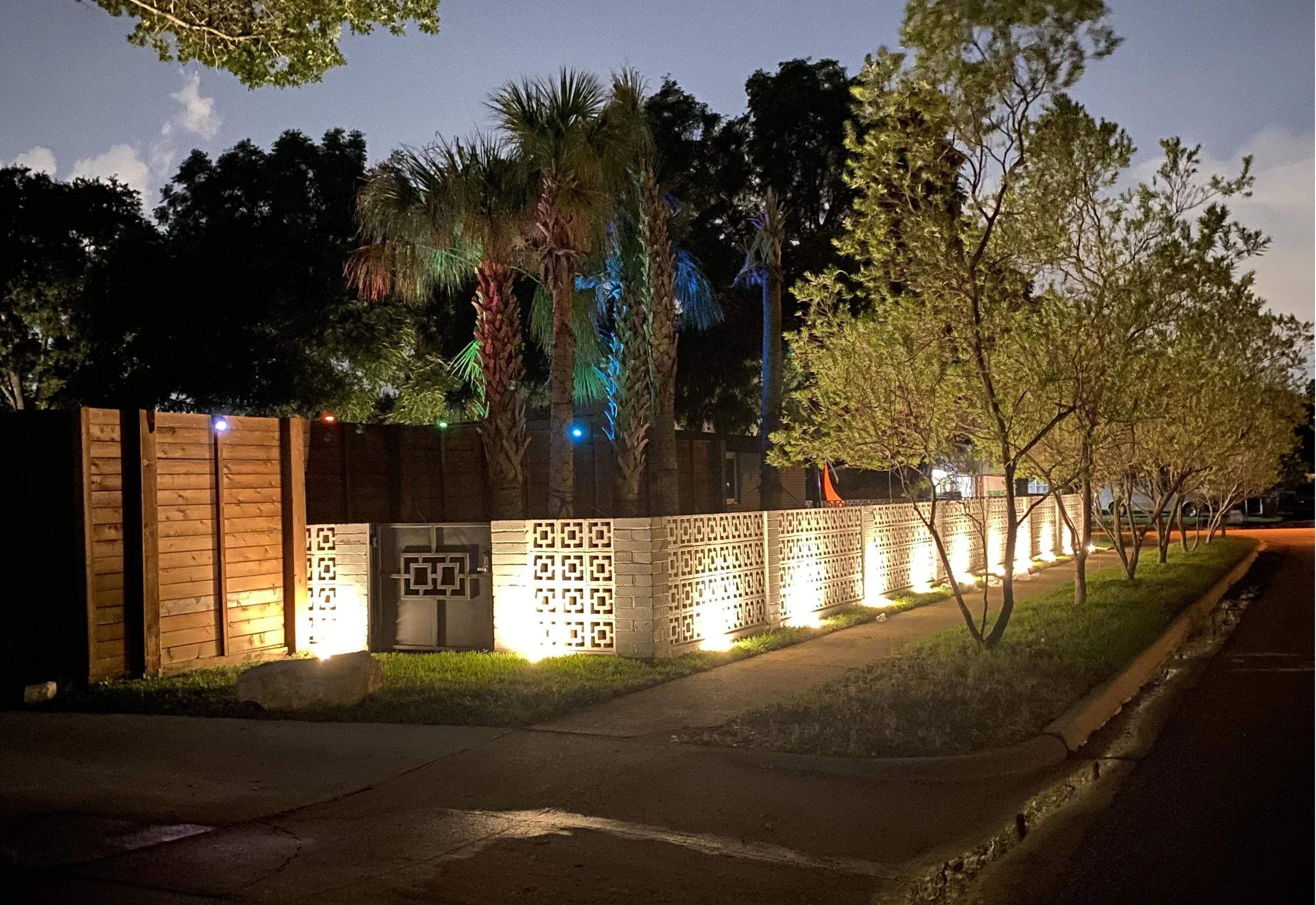 The backyard landscape transports you to a tropical paradise where a swimming pool of turquoise waters and daring orange mosaic tile awaits. Fuchsia bougainvillea surrounds this utopia and palm trees tower over a colorful mid-century inspired mural by Ft Worth artist Christopher Joseph Gonzalez. Skillfully designed landscape lighting adds drama to this property in the evening.
