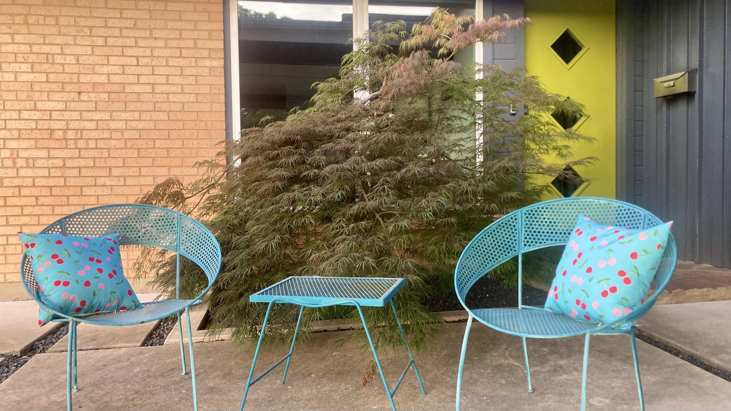 Vintage mid-century ellipise shaped garden chairs and table grace the entry courtyard.